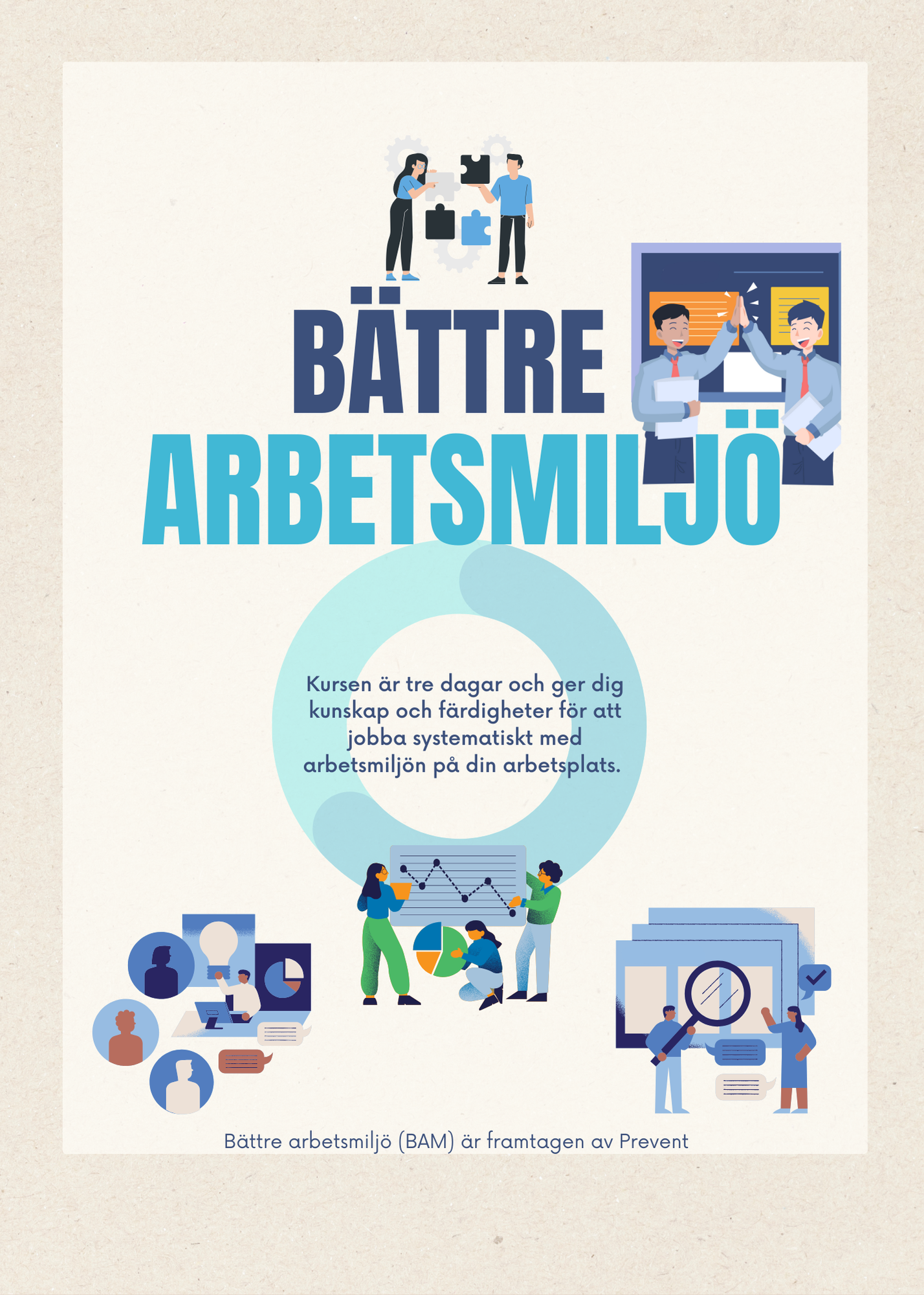 En grundläggande kurs i arbetsmiljö. Vi går igenom lagar och regler och arbetar med praktiska övningar där vi lär oss analysera och förbättra arbetsmiljön tillsammans.